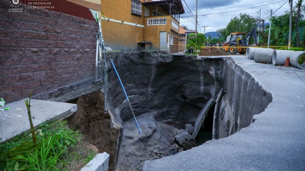 La falla en la bóveda bajo la calle principal de la residencial Brisas de San Francisco que repara el Gobierno del Presidente Bukele está desde el 2000