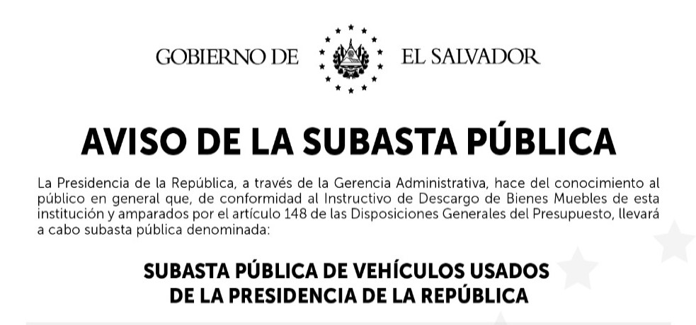 La Presidencia de la República, a través de la Gerencia Administrativa, hace del conocimiento al público en general que, de conformidad al Instructivo de Descargo de Bienes Muebles de esta institución y amparados por el articulo 148 de las Disposiciones Generales del Presupuesto, llevará a cabo subasta pública denominada: SUBASTA PUBLICA DE VEHÍCULOS USADOS DE…