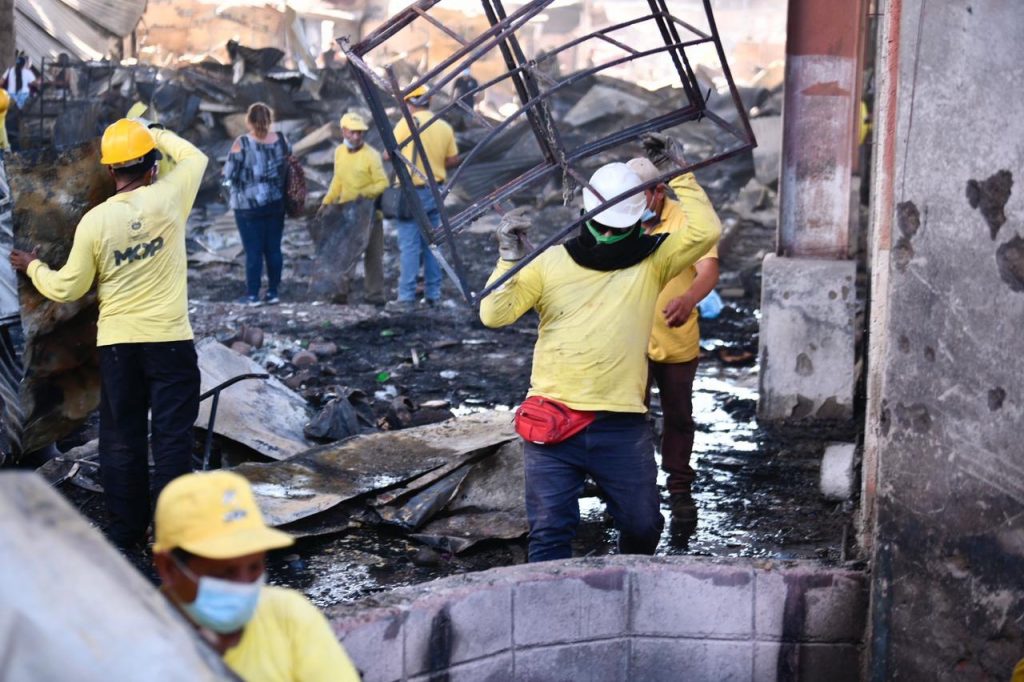 Gobierno continúa con el apoyo de limpieza y remoción de escombros que dejó el incendio en el mercado de Santa Ana